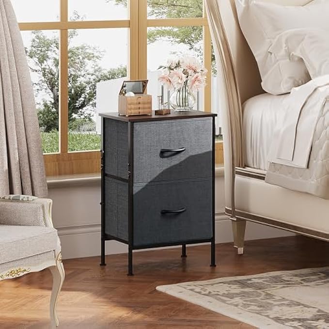 MULTIPURPOSE: This lightweight nightstand is ideal for bedroom, college dorm, living room, office and more. It can be a night stand for bedroom, a convenient end table by sofa or a toy organizer. SPACIOUS STORAGE: The 2 fabric drawers of the small dresser offer large storage space for nighttime necessities. The wood top is ideal to place alarm clock, phone, charger, eyeglasses, keeping them in your reach. STURDY & DURABLE: The nightstand has strong steel frame and water-resistant wooden top to ensure a long service time, easy pull handles to make opening and closing smooth, and 4 adjustable plastic feet to protect floor from scratches. STYLISH DESIGN: The simple and modish design of the bedside furniture matches perfectly with any furnishing style. You can find more fabric dressers of the same collection from WLIVE and make your purchase a bundle. EASY ASSEMBLY: The bedside table can be assembled in 15 minutes with the instructions and tools included in the package. The overall dimensions of the 2 drawer dresser: 15.7" L x 11.8" W x 24.9" H.